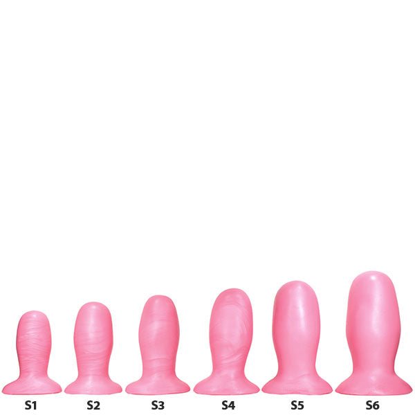 The new S-series sizes comes from customer requests for a plug that would hold the hole open more than the iconic Egg Plug does, as a way to gradually train up to larger sizes in the line. The thick necks work well as a warm-up to anal sex. The sizes range from S1 (4.3"/11cm circ) to S6 (7"/18cm circ)."