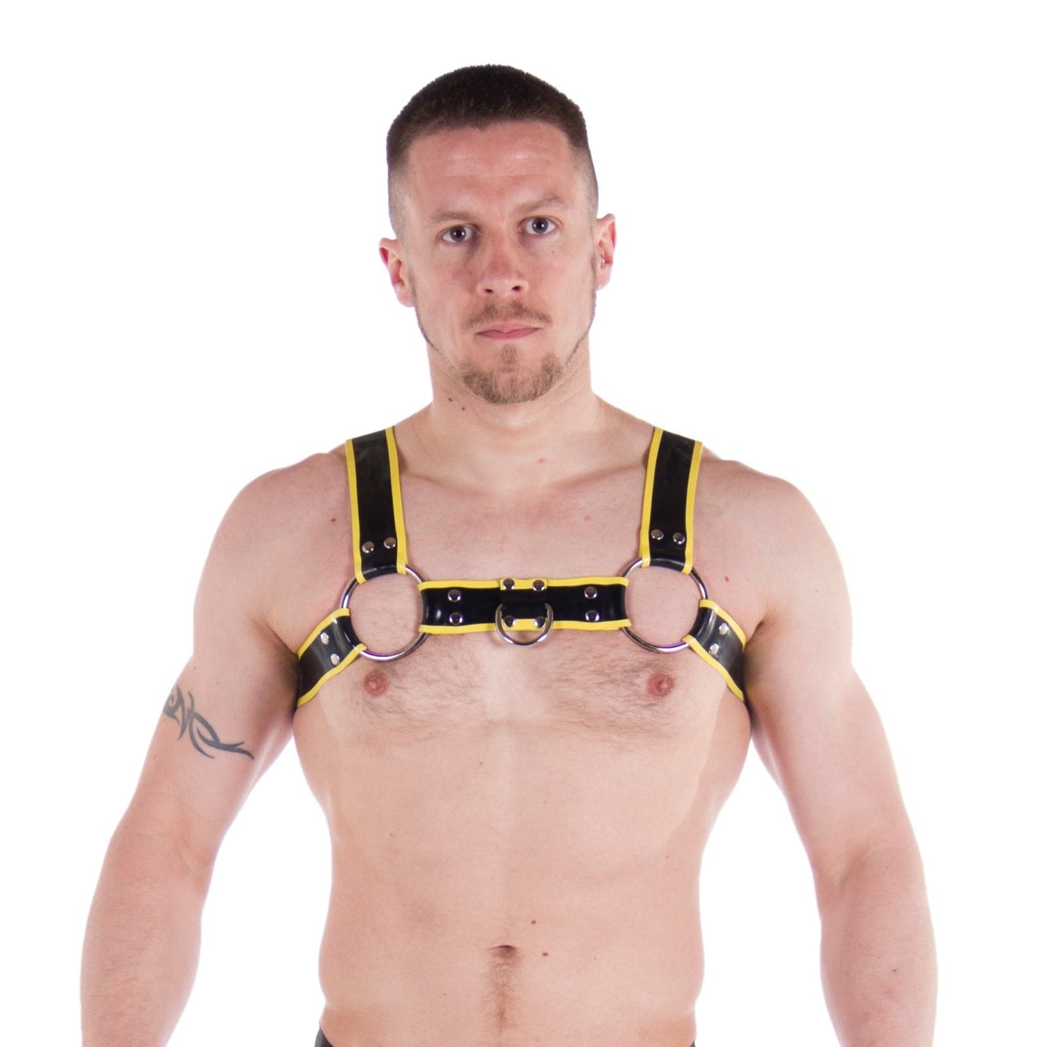 Notre harnais en caoutchouc H personnalisé est un style bouledogue fabriqué à partir d'un matériau en latex épais. Nous avons ajouté une bordure en latex contrastée autour de chaque bord et elle est disponible en quatre tailles pour permettre un design sans couture. Comprend également un anneau en D avant.