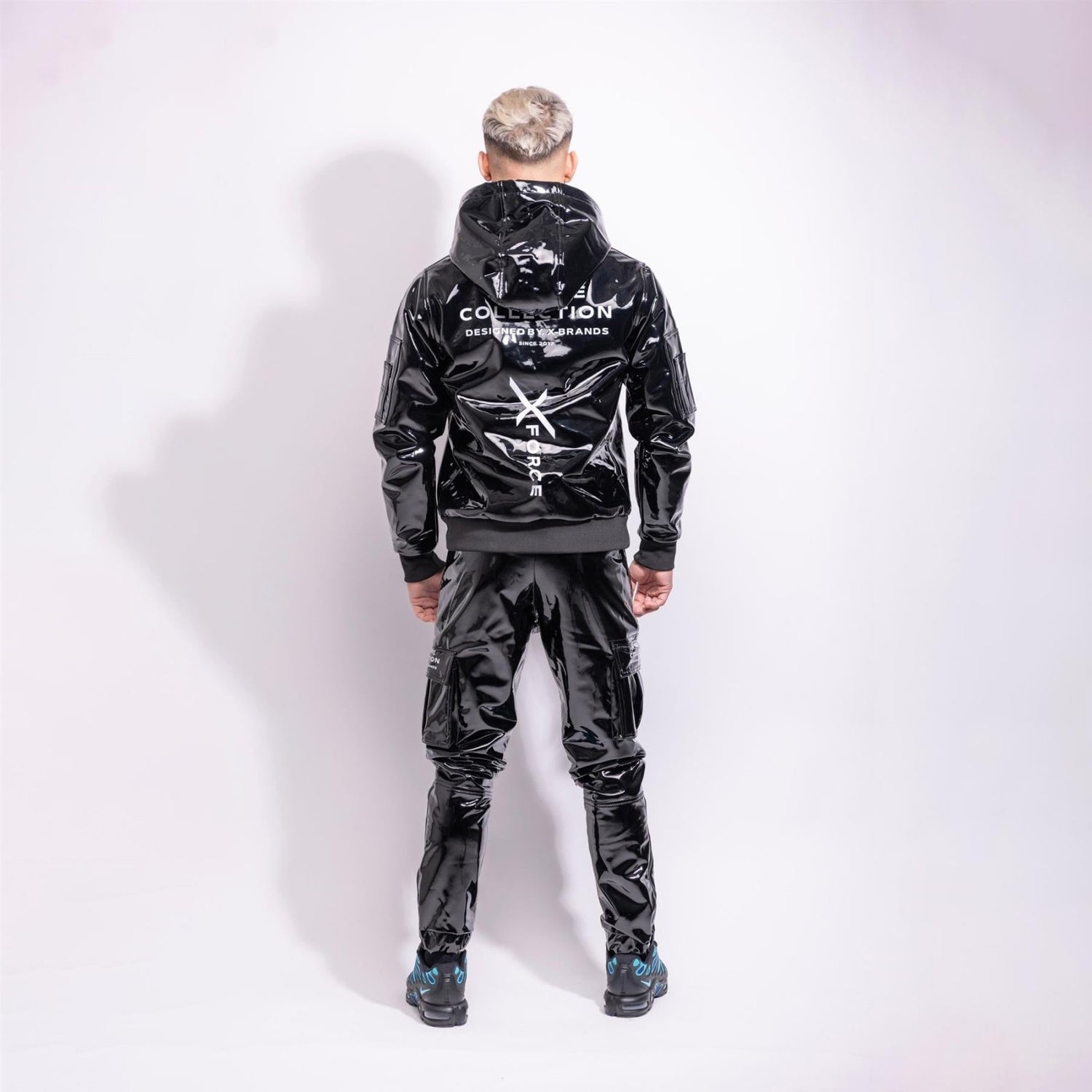 The high-gloss PVC Pro outer surface reacts to light and movement, sharpening the outline of the body. Inside, smooth, shiny nylon lining keeps the hoodie close and controlled without adding bulk. The double-layer construction gives it form, stability, and presence, whether worn alone or integrated into a full X-Force setup.